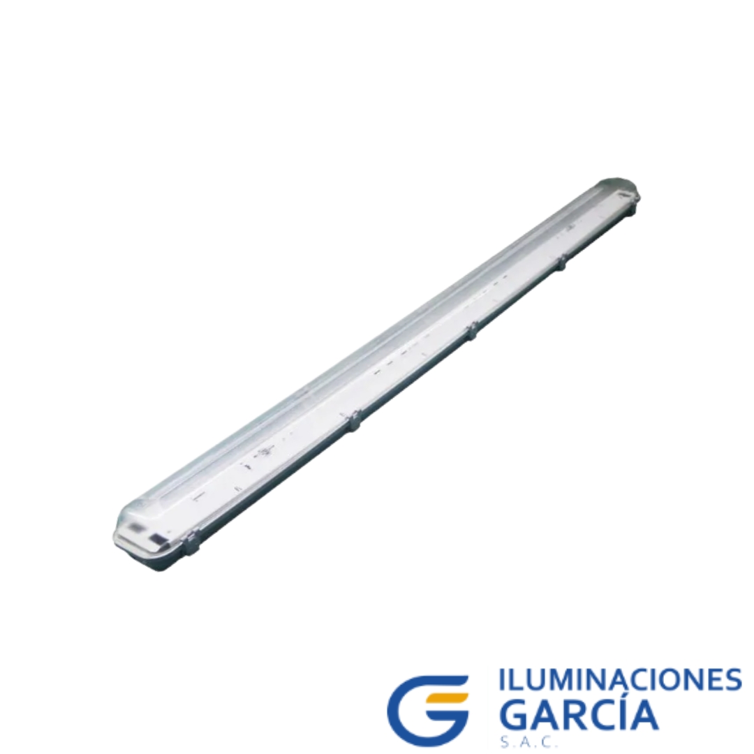 luminaria hermética convencional para dos fluorescentes convencionales T8 de 36W, construida en policarbonato autoextingible, con grado de protección IP65, balasto electrónico EB-CI para fluorescentes TLD, sockets G13.